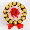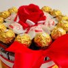 Složení: 32 ks čokoládových tyčinek Merci, 6 ks bonbonů Raffaello, 14 ks bonbonů Ferrero Rocher, umělá růžička, floristické doplňky.