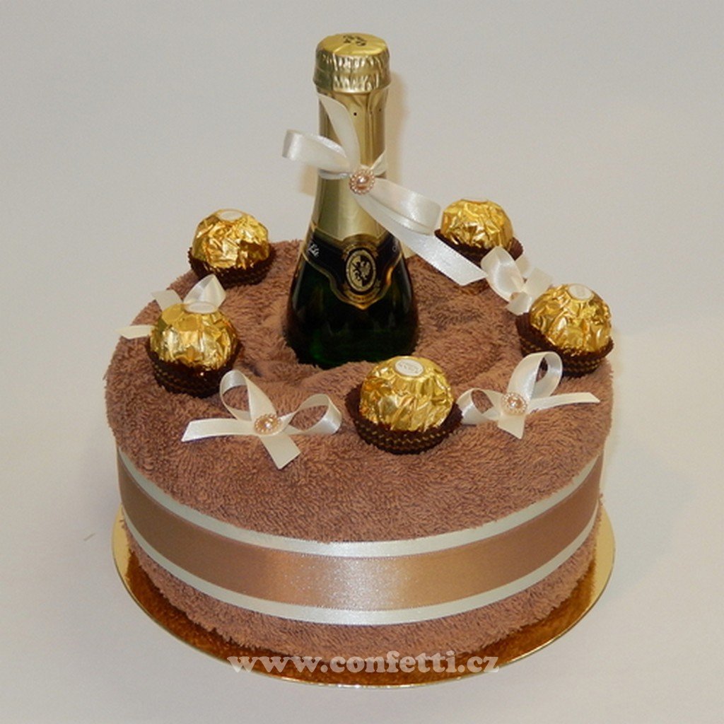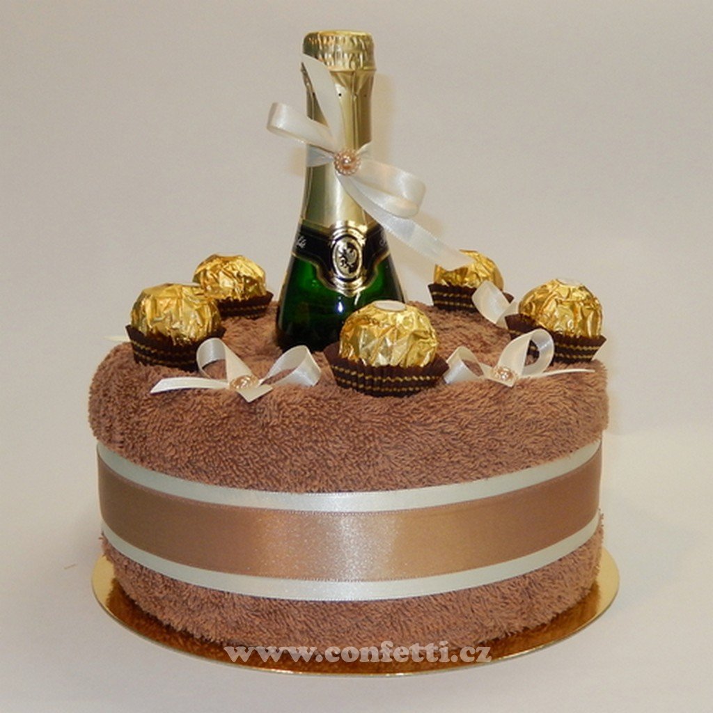 Elegantní textilní dort z kvalitní osušky hnědé barvy. Tento vtipný dárek je vhodný pro každou příležitost, k svátku, narozeninám, výročí nebo na oslavu. Dle přání můžeme přidat číslovku nebo vzkaz pro obdarovaného, napište prosím o tom do poznámky.