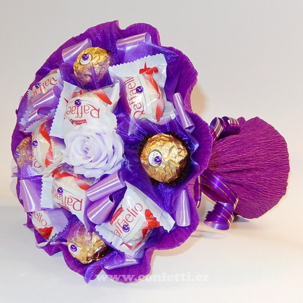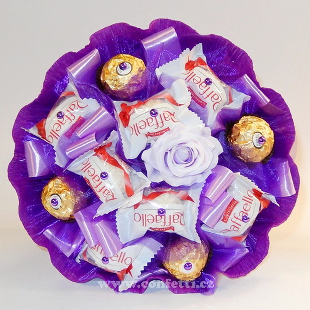 Složení: luxusní bonbóny Raffaello (7 ks), Ferrero Rocher (4 ks), umělá květinka, floristické doplňky.