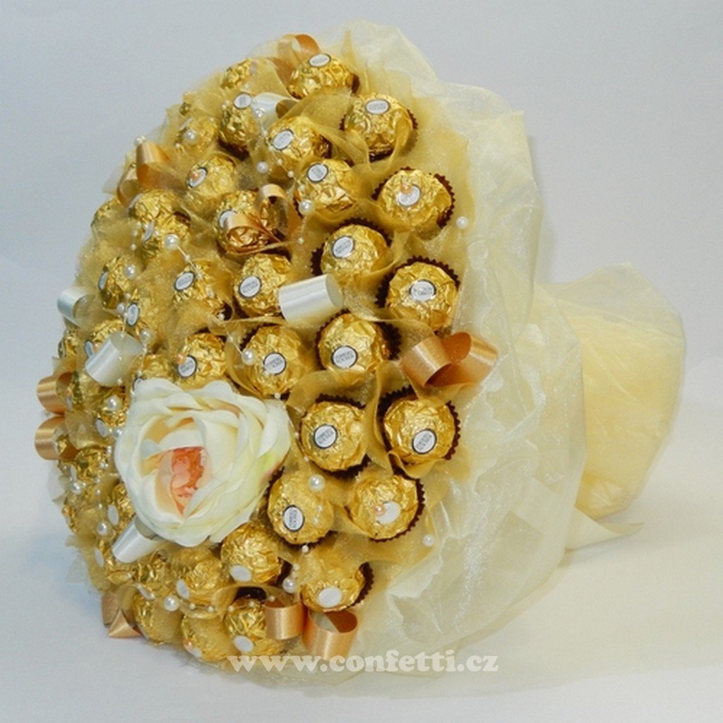 Složení: lahodné čokoládové bonbóny Ferrero Rocher (50 ks), umělá květina, floristické doplňky.