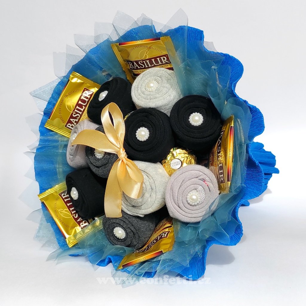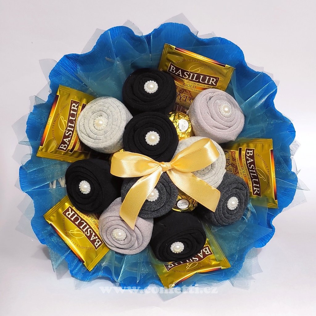 Kytice je složena z 5 párů ponožek, bonbonů, čajů a floristických doplňků