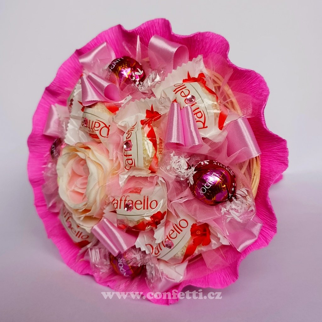 Složení: lahodné italské bonbónky Raffaello (7 ks), pralinky Lindt Lidor (4 ks, mix dle skladové dostupnosti), umělá květinka, floristické doplňky.