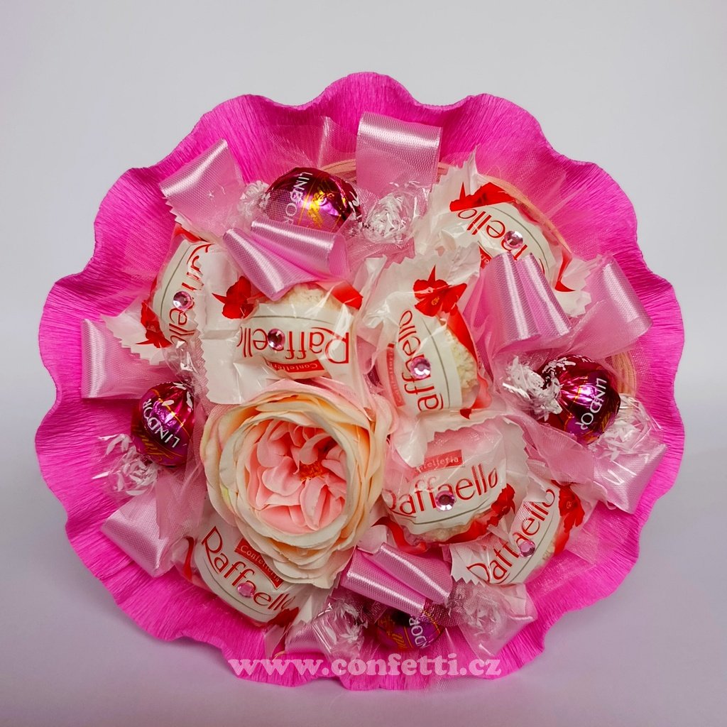 Neokoukaný romantický dárek z bonbonků Raffaello a Lindor. Tato veselá a hezká kytičkka je vhodná k narozeninám, svátku a pro každou další slavnostní příležitost.